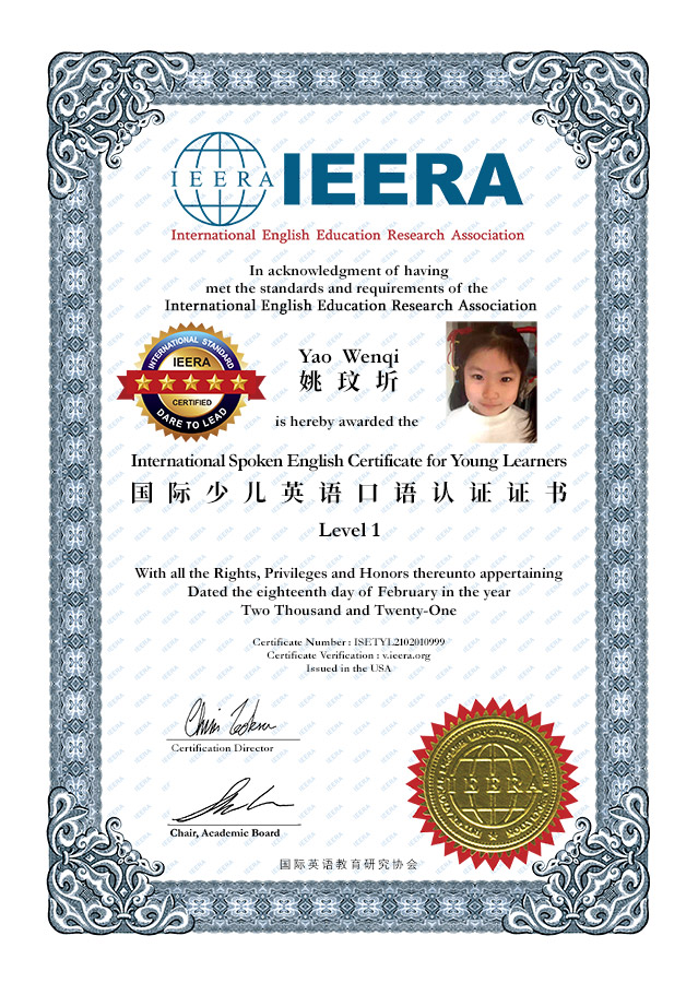 国际英语教育研究协会热烈祝贺姚玟圻同学荣获全球认可的国际少儿英语口语认证考试一级证书
